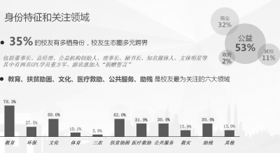 校友所在機(jī)構(gòu)實(shí)力也是外界比較關(guān)注多的話題。數(shù)據(jù)顯示,校友所在企業(yè)有20%為上市公司,校友所在公益機(jī)構(gòu)凈資產(chǎn)總額超過(guò) 110億元。另外,校友所在機(jī)構(gòu)覆蓋了9個(gè)國(guó)字頭基金會(huì),2016年度公募top10占六席,非公募top10占五席。