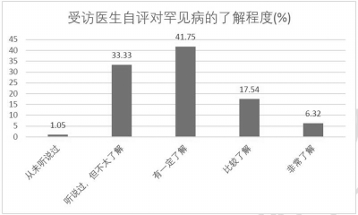除了來(lái)自?xún)?nèi)科的兩名稱(chēng)自己從未聽(tīng)說(shuō)過(guò)罕見(jiàn)病,其余的各科室醫(yī)生均表示對(duì)罕見(jiàn)病有一定的了解。認(rèn)為自己“非常了解”罕見(jiàn)病的醫(yī)生來(lái)則來(lái)自7個(gè)科目。其中,33.3%的耳鼻咽喉科醫(yī)生認(rèn)為自己非常了解。而參訪(fǎng)人數(shù)最多的內(nèi)科和兒科,只有6.2%和16.3%的醫(yī)生有相同的自我評(píng)價(jià)。