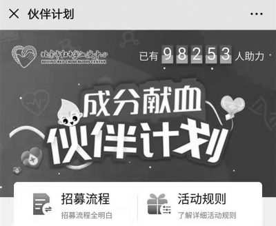 在無償獻血者的招募中,北京市紅十字血液中心也早早引入了“互聯(lián)網(wǎng)+”技術,其中最為亮眼的莫過于首都成分獻血“伙伴計劃”項目。