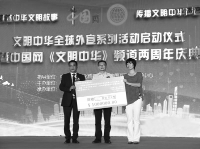 啟動(dòng)儀式上,中國(guó)網(wǎng)文明中華頻道在中國(guó)國(guó)際文化傳播中心和中國(guó)互聯(lián)網(wǎng)新聞中心的指導(dǎo)下,通過(guò)中國(guó)光華科技基金會(huì)捐建“十百千”文明中華圖書(shū)室,即向每個(gè)文明中華圖書(shū)室捐獻(xiàn)十萬(wàn)元圖書(shū)、捐建100個(gè)圖書(shū)室、捐贈(zèng)價(jià)值1千萬(wàn)元的圖書(shū)。本次活動(dòng)現(xiàn)場(chǎng)捐贈(zèng)首批價(jià)值100萬(wàn)元的圖書(shū),用于創(chuàng)建首批10個(gè)文明中華圖書(shū)室。