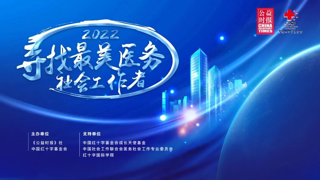 “2022尋找最美醫(yī)務(wù)社會(huì)工作者”系列活動(dòng)由《公益時(shí)報(bào)》社、中國(guó)紅十字基金會(huì)聯(lián)合主辦,中國(guó)紅十字基金會(huì)成長(zhǎng)天使基金、中國(guó)社會(huì)工作聯(lián)合會(huì)醫(yī)務(wù)社會(huì)工作專業(yè)委員會(huì)、紅十字國(guó)際學(xué)院支持。