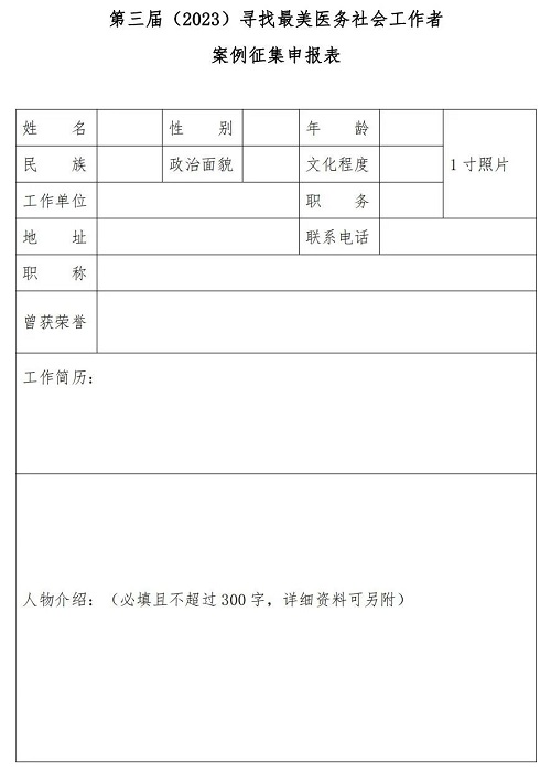 (點(diǎn)擊鏈接http://m.adamut.com/files/2023/04/747923088217443f9d988ae3ff3abea0.docx下載第三屆(2023)尋找最美醫(yī)務(wù)社會(huì)工作者案例征集申報(bào)表)
