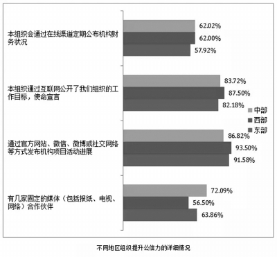 根據(jù)調(diào)研建立的評價體系,西部和中部公益組織的互聯(lián)網(wǎng)傳播能力稍弱于東部,但三者之間的差距甚小。