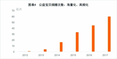 2017年公益寶貝的捐贈次數(shù)達59.8億次,這一數(shù)字是2012年的72倍之多。從消費者角度來看也是如此,2017年有3.5億買家支持了商家的公益行動,人均購買公益相關(guān)的商品17次。