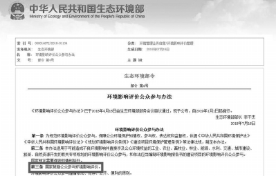生態(tài)環(huán)境部近日印發(fā)了《環(huán)境影響評(píng)價(jià)公眾參與辦法》(以下簡(jiǎn)稱《公參辦法》),于2019年1月1日起實(shí)施。