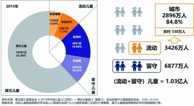 第一,親子分離。截至2015年底,1.03億受人口流動(dòng)影響的兒童中只有33.25%(3426萬)的兒童能夠來到父母的工作地居住,其中只有1542萬的兒童能夠跟父母雙方一起居住。