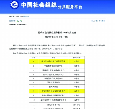 8月9日,民政部社會(huì)組織管理局發(fā)布《民政部登記社會(huì)服務(wù)機(jī)構(gòu)2018年度檢查擬定結(jié)論公示(第一批)》,對(duì)45家機(jī)構(gòu)的擬定結(jié)論進(jìn)行公示,有多達(dá)10家機(jī)構(gòu)未參檢。其中,名為“中寵寵物及用品發(fā)展服務(wù)中心”連續(xù)四年未參檢,“曙光防盲和低視力康復(fù)研究院”在連續(xù)兩年年檢不合格后又連續(xù)兩年未參檢。