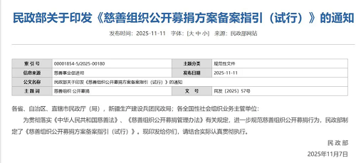 為進(jìn)一步規(guī)范慈善組織公開募捐方案?jìng)浒腹ぷ鳎岣吖_募捐方案?jìng)浒副硖顖?bào)質(zhì)量,11月11日,民政部官網(wǎng)發(fā)布《慈善組織公開募捐方案?jìng)浒钢敢?試行)》(以下簡(jiǎn)稱《指引》),自2026年1月1日起施行。