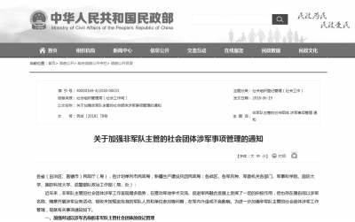 《通知》要求加強(qiáng)對(duì)冠以涉軍名稱的非軍隊(duì)主管社會(huì)團(tuán)體的登記管理;規(guī)范非軍隊(duì)主管社會(huì)團(tuán)體開展涉軍業(yè)務(wù)活動(dòng)管理;嚴(yán)格軍隊(duì)人員和單位參加社會(huì)團(tuán)體及其活動(dòng)管理。