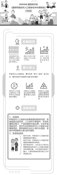 ■ 本報(bào)記者 王勇 為積極應(yīng)對人口老齡化,按照黨的十九大決策部署,近日,中共中央、國務(wù)院印發(fā)了《國家積極應(yīng)對人口老齡化中長期規(guī)劃》(以下簡稱《規(guī)劃》)?!兑?guī)劃》近期至2022年,中期至2035年,遠(yuǎn)期展望至2050年,是到本世紀(jì)中葉我國積極應(yīng)對人口老齡化的戰(zhàn)略性、綜合性、指導(dǎo)性文件。 《規(guī)劃》明確了積極應(yīng)對人口老齡化的戰(zhàn)略目標(biāo),即積極應(yīng)對人口老齡化的制度基礎(chǔ)持續(xù)鞏固,財(cái)富儲備日益充沛,人力資本不斷提升,科技支撐更加有力,產(chǎn)品和服務(wù)豐富優(yōu)質(zhì),社會環(huán)境宜居友好,經(jīng)濟(jì)社會發(fā)展始終與人口老齡化進(jìn)程相適應(yīng),順利建成社會主義現(xiàn)代化強(qiáng)國,實(shí)現(xiàn)中華民族偉大復(fù)興的中國夢。 到2022年,我國積極應(yīng)對人口老齡化的制度框架初步建立;到2035年,積極應(yīng)對人口老齡化的制度安排更加科學(xué)有效;到本世紀(jì)中葉,與社會主義現(xiàn)代化強(qiáng)國相適應(yīng)的應(yīng)對人口老齡化制度安排成熟完備。 《規(guī)劃》從5個(gè)方面部署了應(yīng)對人口老齡化的具體工作任務(wù)。 我國老齡化程度將持續(xù)加深 人口老齡化是社會發(fā)展的重要趨勢,是人類文明進(jìn)步的體現(xiàn),也是今后較長一段時(shí)期我國的基本國情。我國自20世紀(jì)末進(jìn)入老齡化社會以來,老年人口數(shù)量和占總?cè)丝诘谋戎爻掷m(xù)增長,2000年至2018年,60歲及以上老年人口從1.26億人增加到2.49億人,老年人口占總?cè)丝诘谋戎貜?0.2%上升至17.9%。未來一段時(shí)間,老齡化程度將持續(xù)加深。 國家發(fā)展改革委負(fù)責(zé)人就《國家積極應(yīng)對人口老齡化中長期規(guī)劃》答記者問時(shí)表示,積極應(yīng)對人口老齡化,是黨中央、國務(wù)院正確把握人口發(fā)展大趨勢和老齡化規(guī)律,作出的立足當(dāng)下、著眼長遠(yuǎn)的重大戰(zhàn)略部署,事關(guān)實(shí)現(xiàn)“兩個(gè)一百年”奮斗目標(biāo),事關(guān)實(shí)現(xiàn)中華民族偉大復(fù)興的中國夢,對于堅(jiān)持以人民為中心的發(fā)展思想、實(shí)現(xiàn)經(jīng)濟(jì)高質(zhì)量發(fā)展、維護(hù)國家安全和社會和諧穩(wěn)定,具有重大意義。 積極應(yīng)對人口老齡化是貫徹以人民為中心的發(fā)展思想的內(nèi)在要求;是實(shí)現(xiàn)經(jīng)濟(jì)高質(zhì)量發(fā)展的必要保障;是維護(hù)國家安全和社會和諧穩(wěn)定的重要舉措。 三大階段性目標(biāo) 據(jù)國家發(fā)展改革委負(fù)責(zé)人介紹,積極應(yīng)對人口老齡化的戰(zhàn)略總目標(biāo)是:積極應(yīng)對人口老齡化的制度基礎(chǔ)持續(xù)鞏固,財(cái)富儲備日益充沛,人力資本不斷提升,科技支撐更加有力,產(chǎn)品和服務(wù)豐富優(yōu)質(zhì),社會環(huán)境宜居友好,經(jīng)濟(jì)社會發(fā)展始終與人口老齡化進(jìn)程相適應(yīng),順利建成社會主義現(xiàn)代化強(qiáng)國,實(shí)現(xiàn)中華民族偉大復(fù)興的中國夢。 階段性目標(biāo)分別是:到2022年,積極應(yīng)對人口老齡化的制度框架初步建立。全員勞動生產(chǎn)率平穩(wěn)增長,勞動年齡人口平均受教育年限穩(wěn)步提升?;攫B(yǎng)老保險(xiǎn)和基本醫(yī)療保險(xiǎn)基本實(shí)現(xiàn)法定人員全覆蓋,養(yǎng)老保障水平正常調(diào)整機(jī)制初步建立。多層次養(yǎng)老保險(xiǎn)制度體系初步構(gòu)建,功能完善、規(guī)模適度、覆蓋城鄉(xiāng)、醫(yī)養(yǎng)結(jié)合的養(yǎng)老服務(wù)體系基本建成,老年宜居的社會環(huán)境初步建立。 到2035年,積極應(yīng)對人口老齡化的制度安排更加科學(xué)有效,社會財(cái)富儲備進(jìn)入高收入國家行列。全員勞動生產(chǎn)率合理增長,總體實(shí)現(xiàn)教育現(xiàn)代化。基本養(yǎng)老保險(xiǎn)和基本醫(yī)療保險(xiǎn)應(yīng)保盡保,實(shí)現(xiàn)法定人員全覆蓋。構(gòu)建起多層次養(yǎng)老保險(xiǎn)制度體系。主要健康指標(biāo)進(jìn)入高收入國家行列,人均預(yù)期壽命和健康預(yù)期壽命穩(wěn)步提升,老年人健康水平不斷提高,有序銜接、綜合連續(xù)的健康服務(wù)體系基本形成。中國特色養(yǎng)老服務(wù)體系成熟定型,全體老年人享有基本養(yǎng)老服務(wù)。國家創(chuàng)新能力躋身世界前列,科技對應(yīng)對人口老齡化的支撐作用顯著增強(qiáng)。老年友好型社會總體建成。 到本世紀(jì)中葉,與社會主義現(xiàn)代化強(qiáng)國相適應(yīng)的應(yīng)對人口老齡化制度安排成熟完備,老年友好城市、友好鄉(xiāng)村、友好社區(qū)遍布全國,全體人民生活更加幸福安康,中華民族實(shí)現(xiàn)偉大復(fù)興,以更加昂揚(yáng)的姿態(tài)屹立于世界民族之林。 五方面具體任務(wù) 《規(guī)劃》從5個(gè)方面部署了應(yīng)對人口老齡化的具體工作任務(wù)。 第一,夯實(shí)應(yīng)對人口老齡化的社會財(cái)富儲備。通過擴(kuò)大總量、優(yōu)化結(jié)構(gòu)、提高效益,實(shí)現(xiàn)經(jīng)濟(jì)發(fā)展與人口老齡化相適應(yīng)。通過完善國民收入分配體系,優(yōu)化政府、企業(yè)、居民之間的分配格局,穩(wěn)步增加養(yǎng)老財(cái)富儲備。健全更加公平更可持續(xù)的社會保